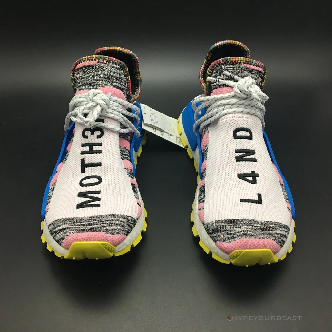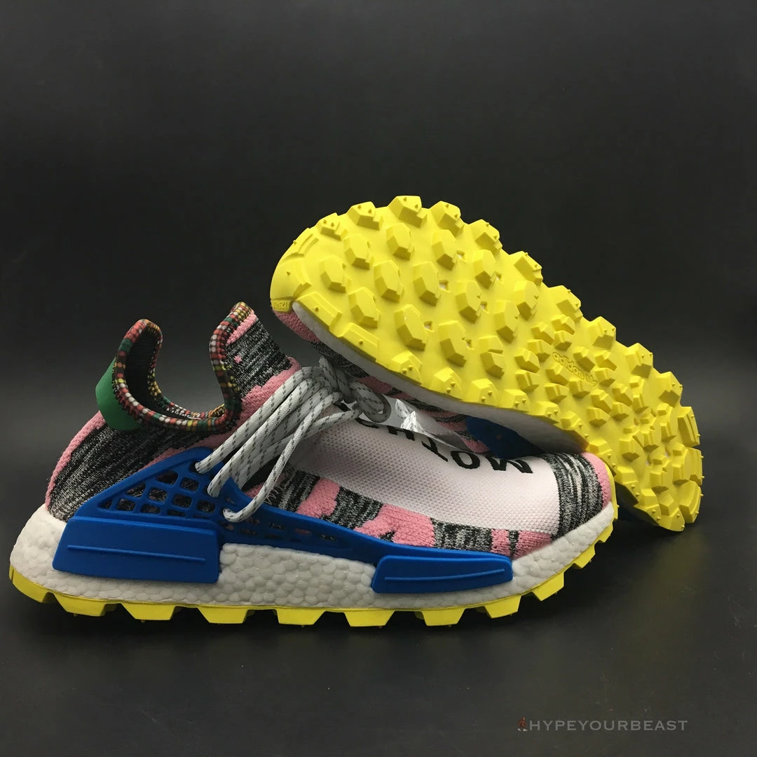 Adidas NMD Human Race Solar Pack is a pair of highly incredible sneakers due to its unique style and memorial look. This footwear honors the traditional African art designs, making it more fantastic to wear. Adidas NMD Hu Pharrell Solar Pack carries striped upper in heather grey, pink, and yellow accents. It also brings out white midsoles with blue TPU cages to hold the white laces. Furthermore, the sneakers also showcase green heel tabs and ragged bright yellow outsoles. Wearing this footwear is completed with black numbers and letter prints on the upper.