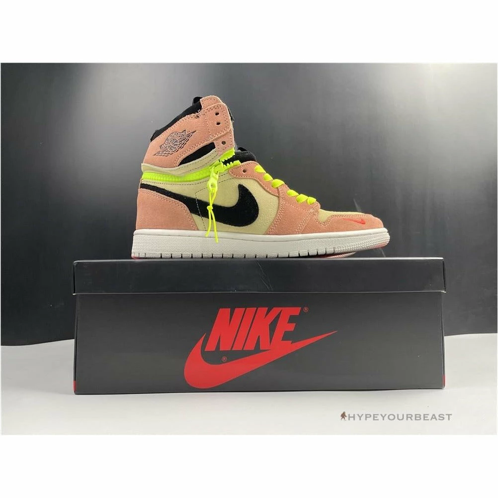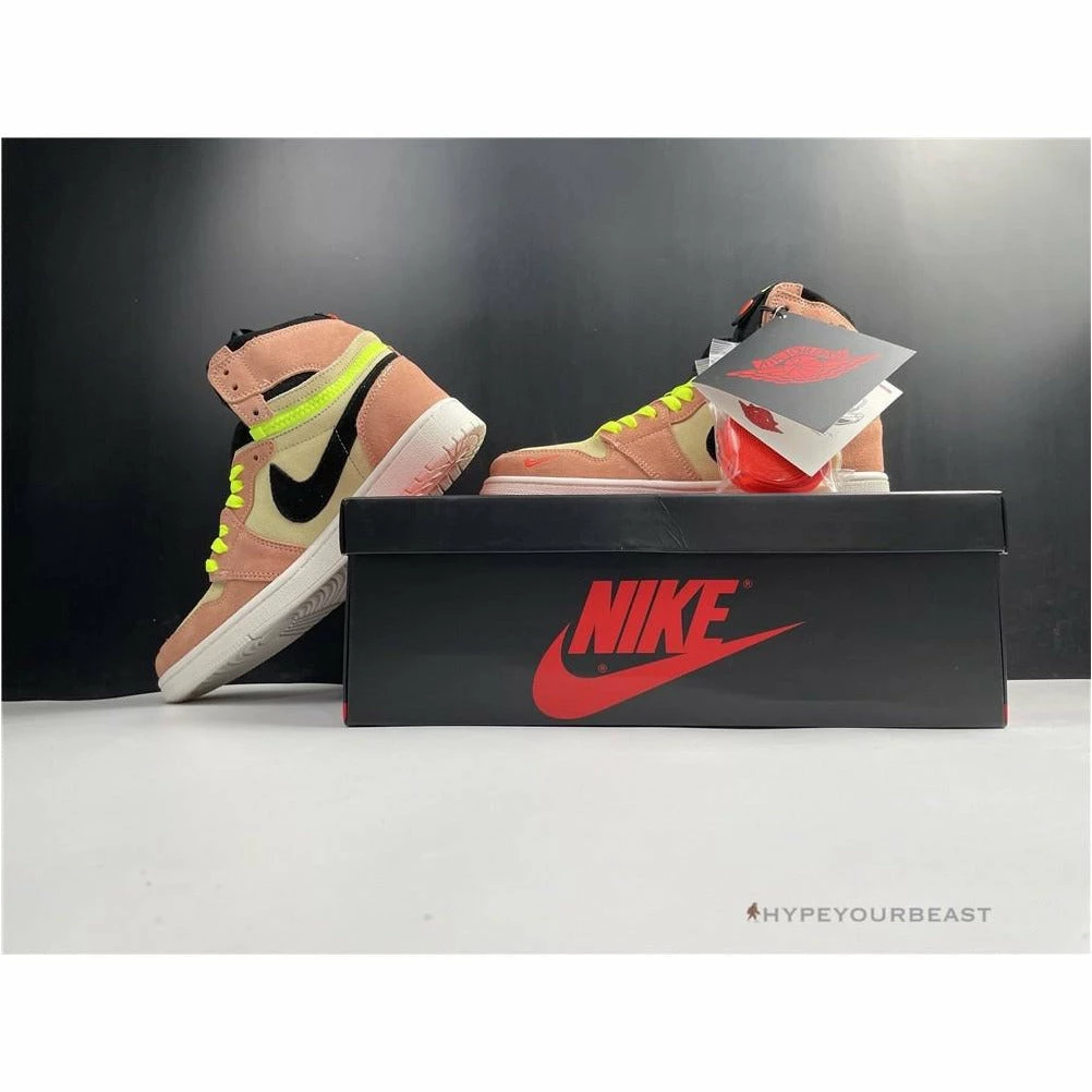 The stylish Air Jordan 1 High Switch ‘Pink Volt’ provides you multicolor effects on your feet. It has a premium suede construction with excellent overlays. Air Jordan 1 High Switch ‘Pink Volt’ showcases tan upper with pink accents on the forefoot, side panels, eyelets, heels, and collars. It also offers you black tones on its Nike Swoosh, interiors, and tongue. Air Jordan 1 High Switch ‘Pink Volt’Â is completed with white soles, green laces, and a green zipper design on its collars.