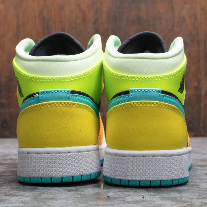 Flaunt the eye-catching Air Jordan 1 Mid GS Aurora Green Optic-Yellow and let everyone stare in its vivid yet sophisticated pattern.