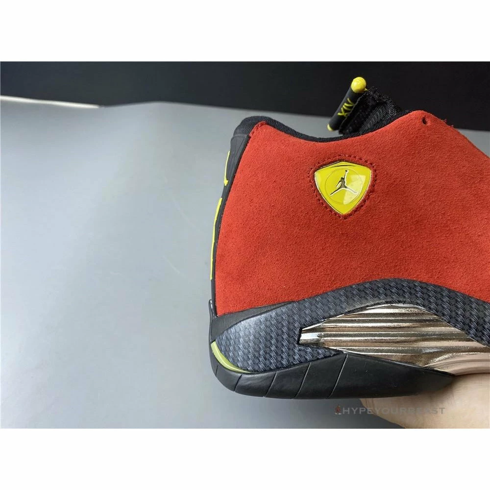 Air Jordan 14 Ferrari Red owns varsity red, black, and vibrant yellow tones as inspiration from a luxurious brand of a sports car. Its upper part includes varsity red suede with black accenting, particularly the chrome grill shank plate and Carbon Fiber shark teeth located on the midsole. The Jumpman logo with a vibrant yellow accent is seen near the ankles as it reveals the Ferrari brand. Air Jordan 14 Ferrari Red was known during the World Basketball festival last 2014 and still standouts until today. So, grab one for you and embody the luxury style on your feet.