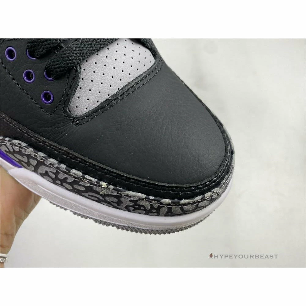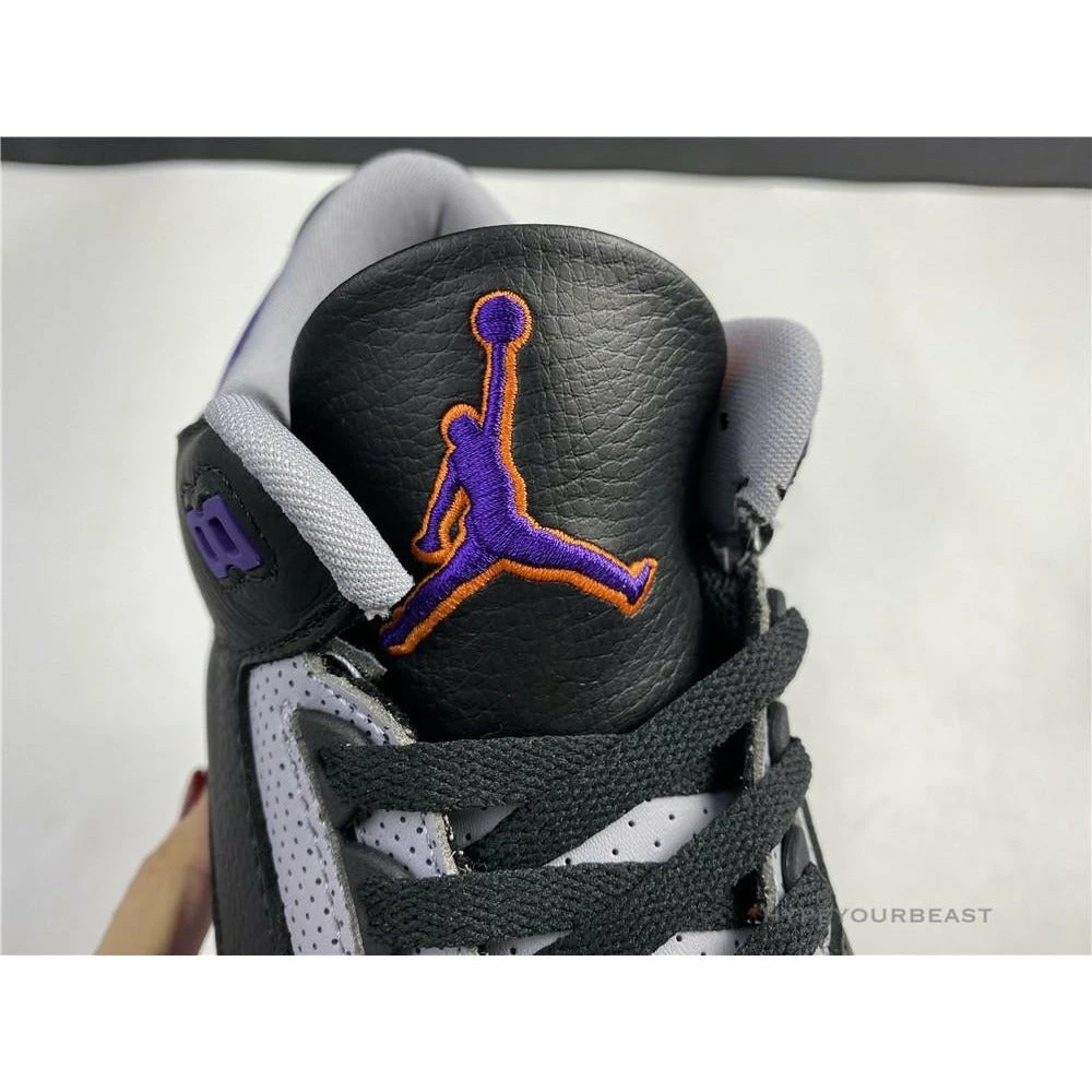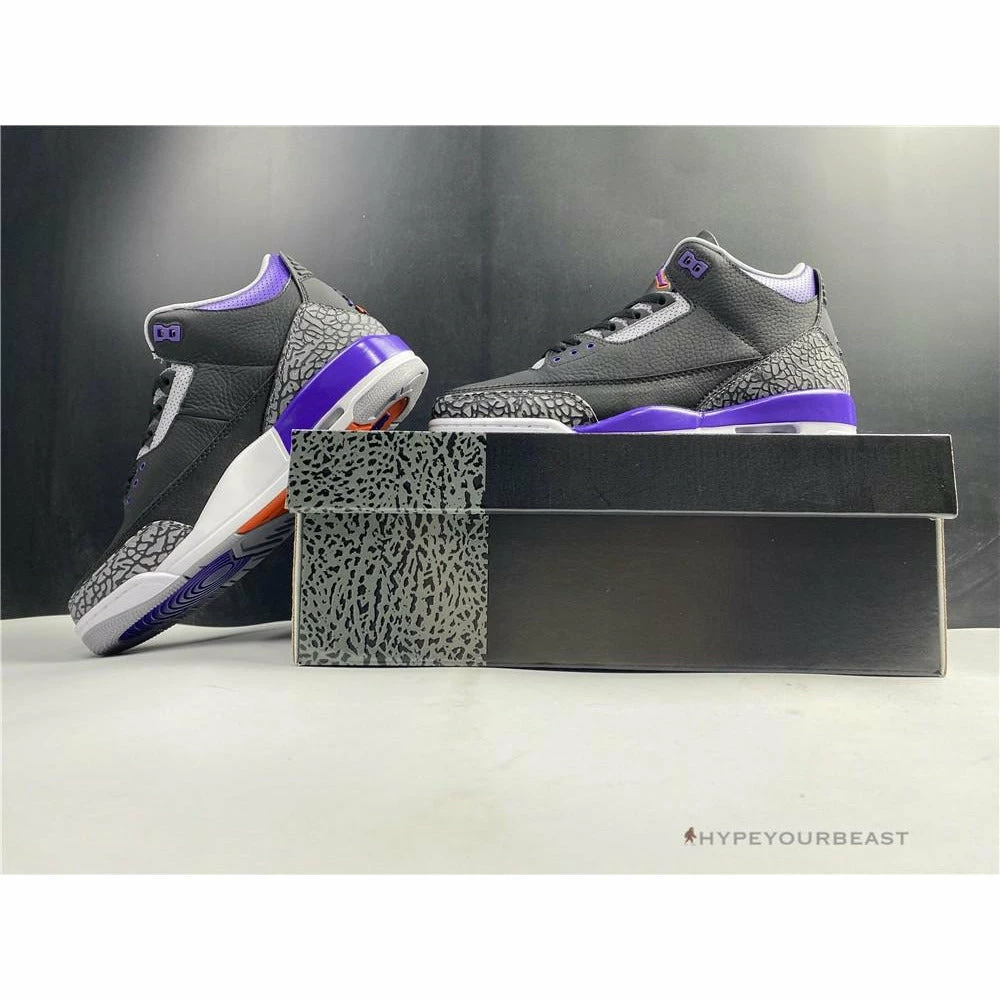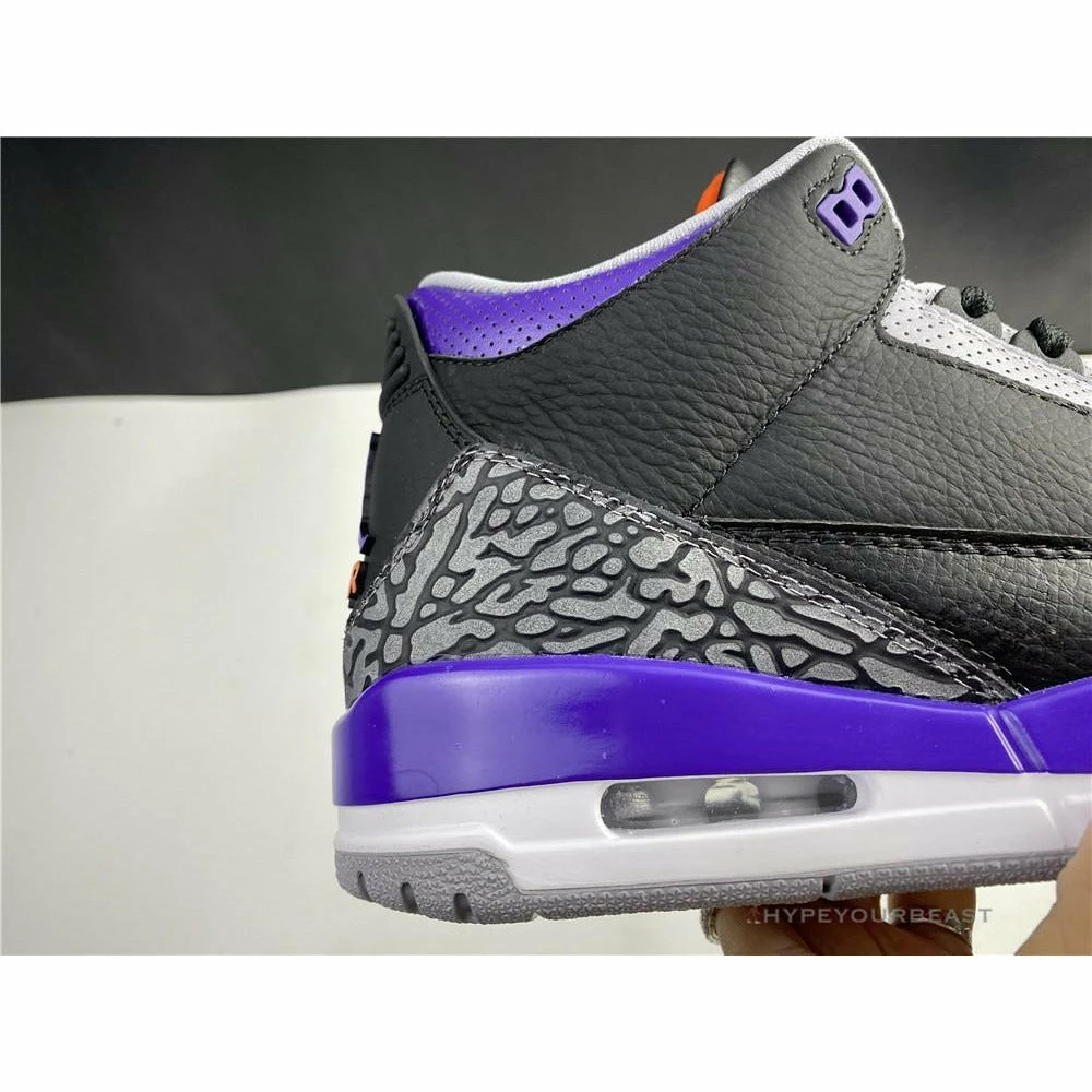 Air Jordan 3 ‘Court Purple Black Cement’ showcases intense black bases with purple and grey cement overlays. The sneakers have black leather upper construction with grey cement accents on the forefoot and mudguard sides. Other than that, an iconic purple Jumpman logo with orange embroidery is placed on the tongue tab on the pair. The shoes are completed with a purple Jumpman with an orange AIR label. Moreover, the sneakers also feature a visible Air technology on the white midsole and grey rubber outsoles.