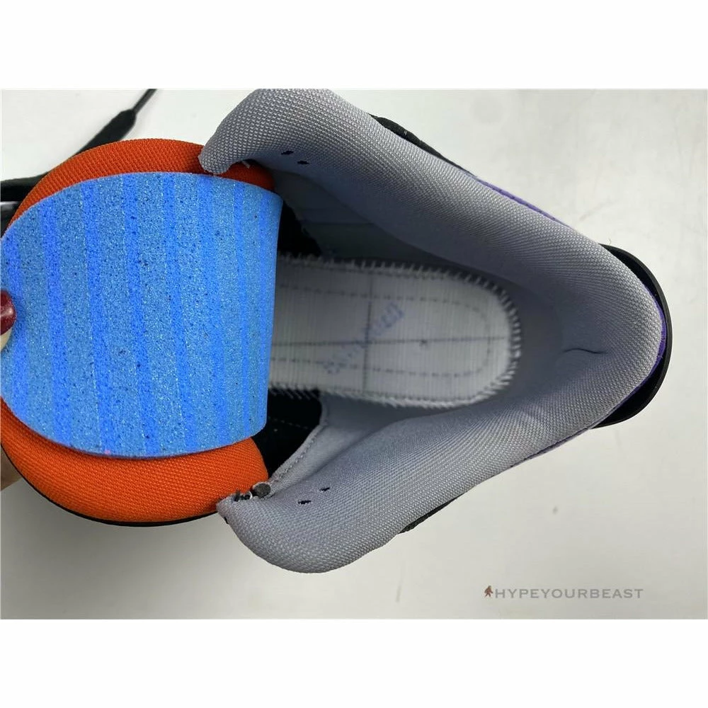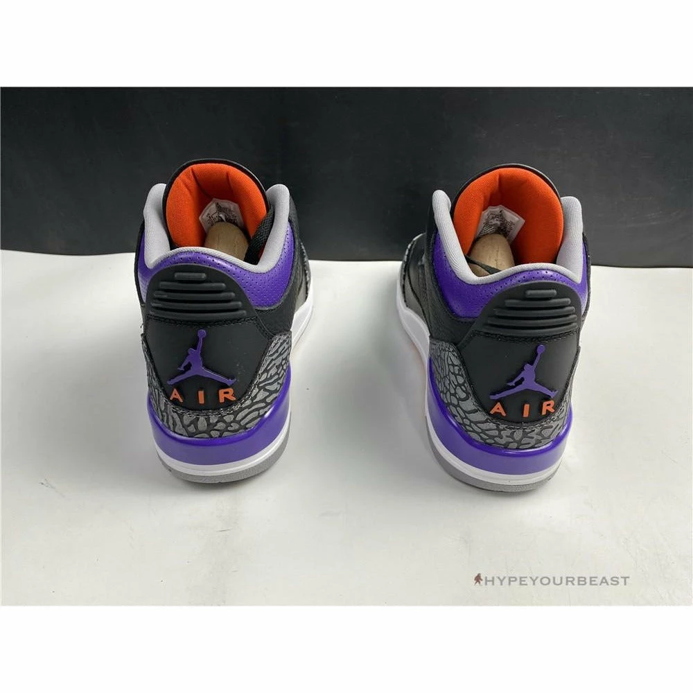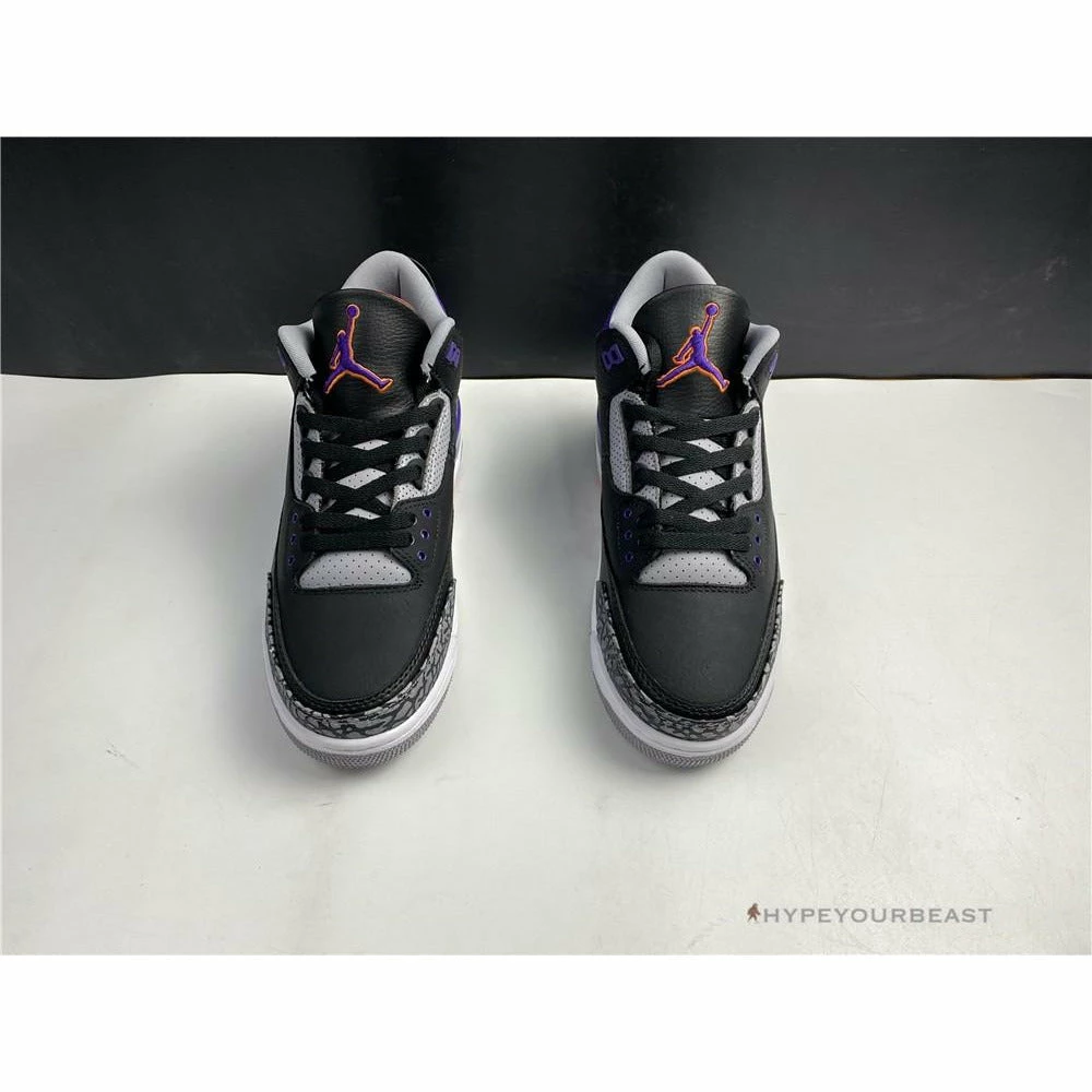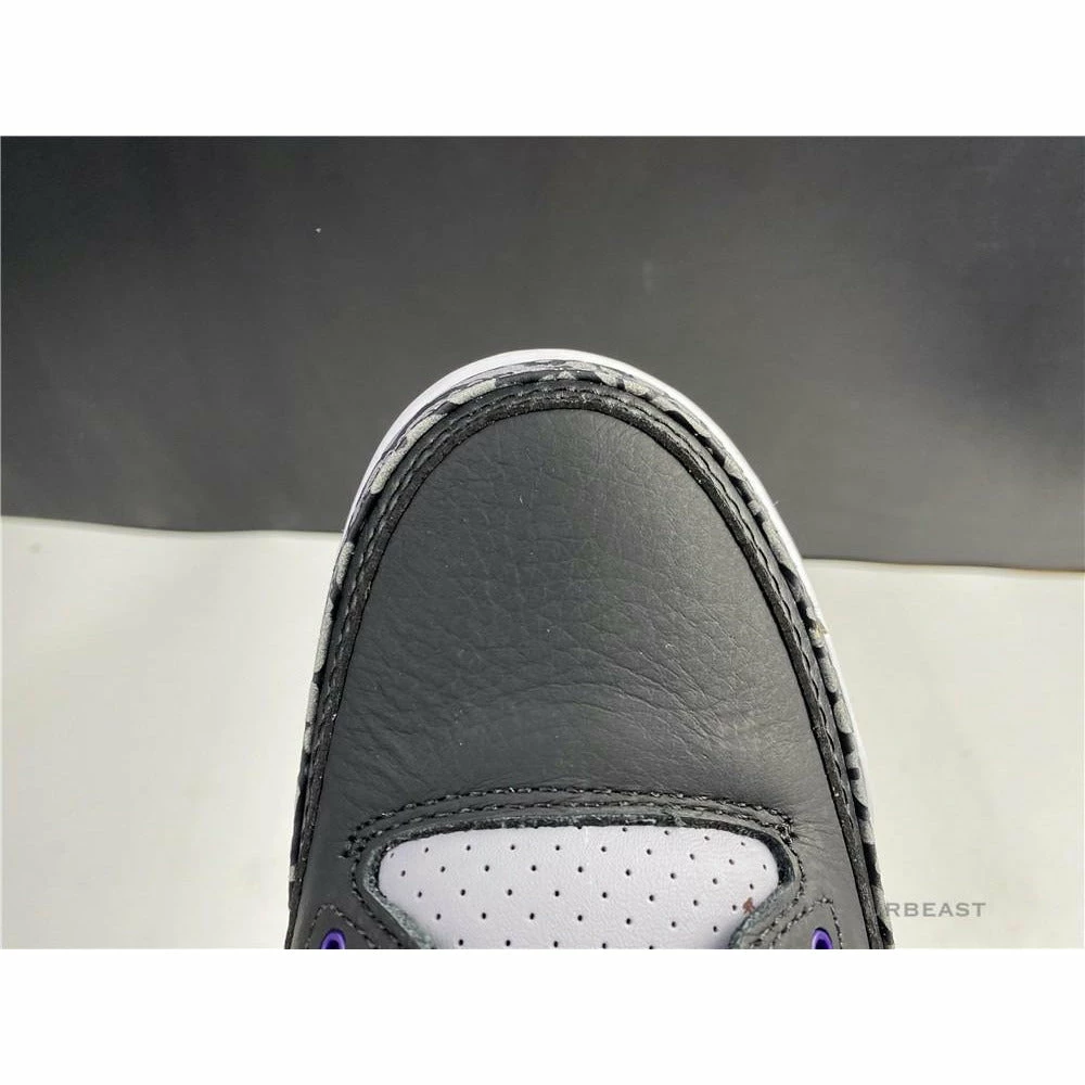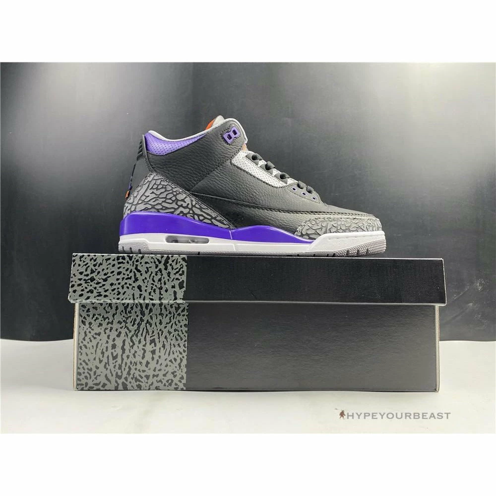 Air Jordan 3 ‘Court Purple Black Cement’ showcases intense black bases with purple and grey cement overlays. The sneakers have black leather upper construction with grey cement accents on the forefoot and mudguard sides. Other than that, an iconic purple Jumpman logo with orange embroidery is placed on the tongue tab on the pair. The shoes are completed with a purple Jumpman with an orange AIR label. Moreover, the sneakers also feature a visible Air technology on the white midsole and grey rubber outsoles.