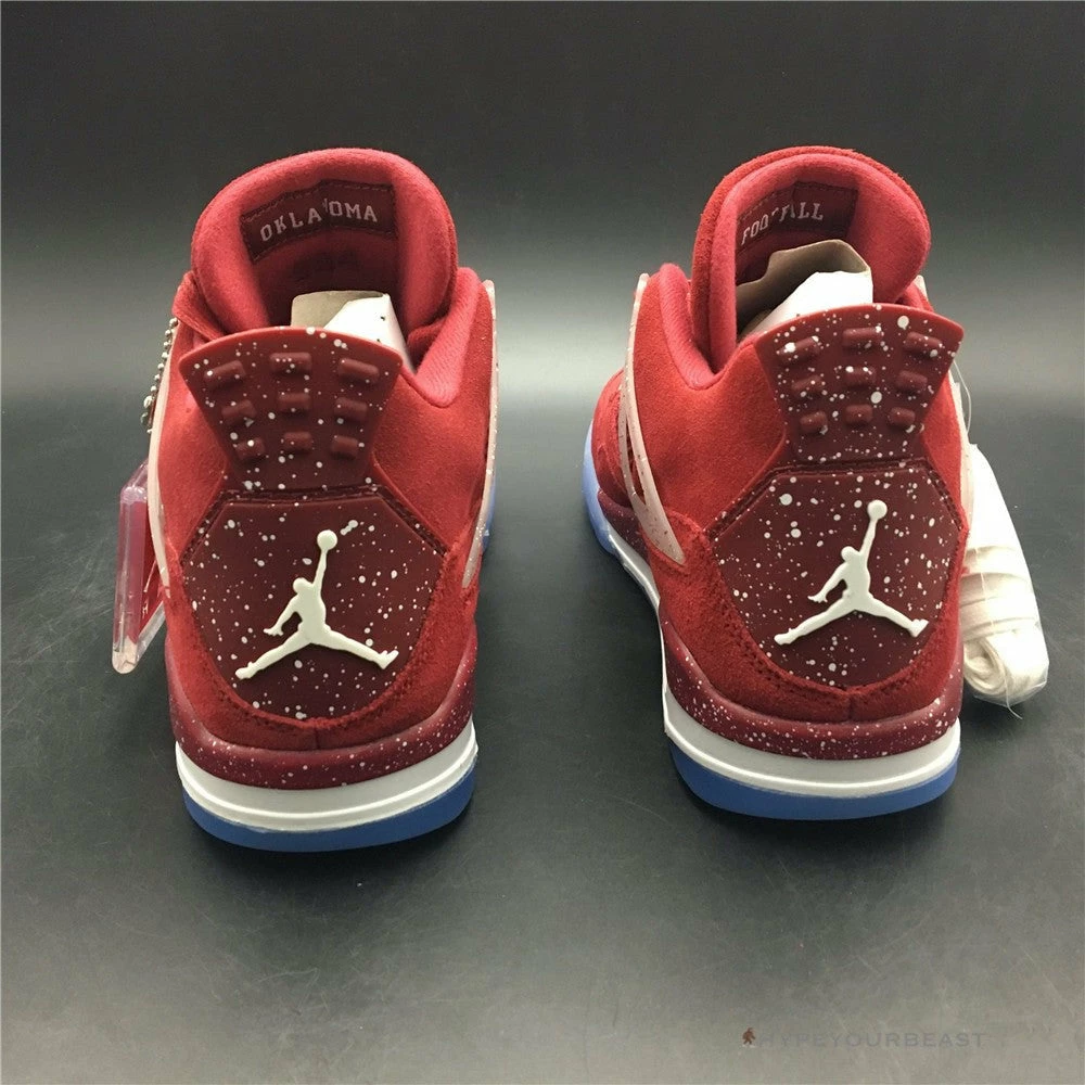Air Jordan 4 Retro Oklahoma Sooners showcases classy Claret Red colorways which gives an excellent look on your feet. The footwear is constructed from suede Claret Red upper with red netted panels and other incredible overlays of red with white paint spots. These white paint-like sprinkles are seen on the eyelets, mudguard, and even at the heel tab. Air Jordan 4 Oklahoma Sooners PE also owns sleeking white midsoles with visible Air sole technology. Moreover, you surely need to possess this footwear due to its captivating clear rubber outsoles.