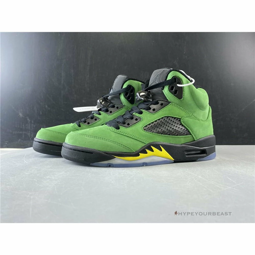 Air Jordan 5 Retro SE Oregon brings back the color scheme of Oregon Ducks which consists of green, black, and yellow hues. As for the Air Jordan 5 Retro SE Oregon, it consists of green suede upper and bases with hints of black shades on the tongue, eyelets, and quarter panel netting. It also includes a black foam midsole complementing with the yellow accent of shark tooth details. To give extra variance, translucent rubber outsoles are added. The labeling of the brand is never forgotten through the woven tag of Team Jordan at the heels.