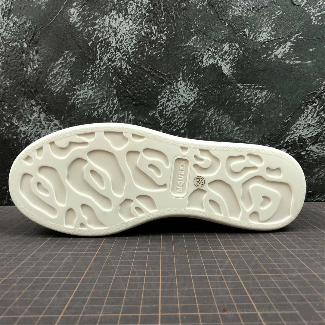 Stunning white sneakers are paired with navy blue accents through Alexander McQueen White / Navy. These kicks have a leather upper construction in white hues, matched with its oversized soles in white. However, Alexander McQueen White / Navy presents you with the navy blue touch on the heel tabs and ankle collars. These sneakers even include the brand name’s label on the heels to complete the look.