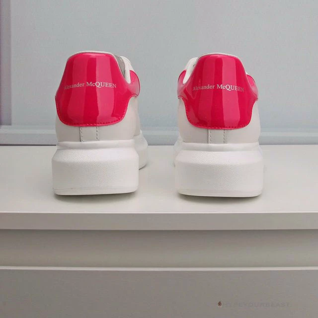 White and glossy pink colorway is mainly featured through the Alexander McQueen White / Pink Lace Up Sneaker. These sneakers own white upper bases with an additional pink glossy effect on the heels and collars. Other than that, the Alexander McQueen labels on the heels and tongue were added. The sneakers are completed with white oversized midsoles and outsoles. Even the laces are in white which made it more clean and minimalist. Most importantly, the sneakers highlight the glossy pair effect on the heel. Order a pair of these incredible shoes and enjoy its ravishing style on your feet.