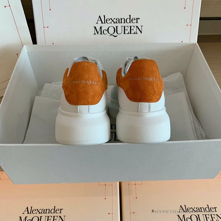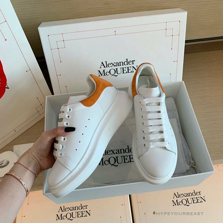 Alexander McQueen Women’s White / Orange Sneaker highlights the orange collar and heel tab hue. It also features the all-white smooth calf leather with clean and fascinating stitching. The pair also own white laces, white midsoles, and white outsoles. Other than that, Alexander McQueen Women’s White / Orange Sneaker was mainly constructed for an oversized patchouli sole making it thick and bold. The sneakers never forgot to flaunt its Alexander Mcqueen signature on the tongue and heel tabs. You can wear this footwear with any outfit you prefer due to its fascinating white tone.