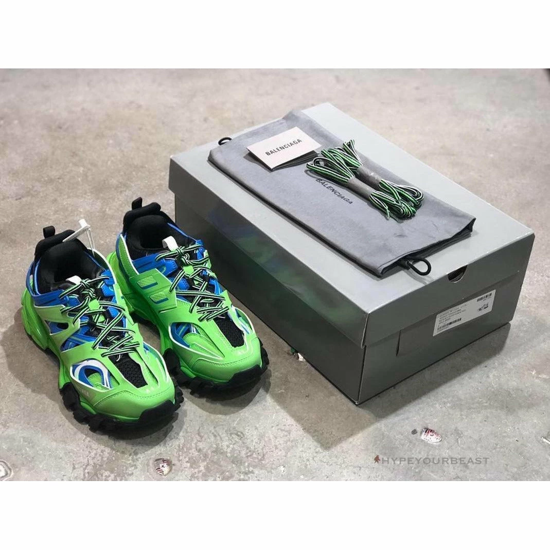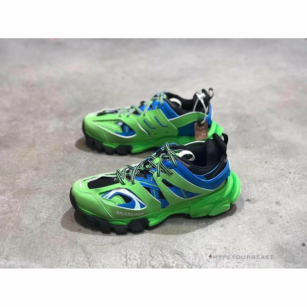 Combination apple green and blue colorways are the main features of Balenciaga Track Trainer Blue Green. It involves iconic nonleather layerings on the upper which showcases both blue bases and green accenting. It also features pull-on tabs on the tongue and heel for more convenient wearings. Besides that, Balenciaga Track Trainer Blue Green brings our smart double laces and impeccable embossed logos on the tongue and outsoles. Wearing these sneakers can let you enjoy its fantastic colorway on your feet.
