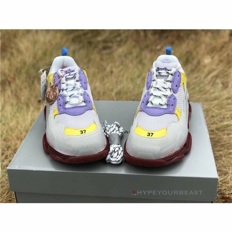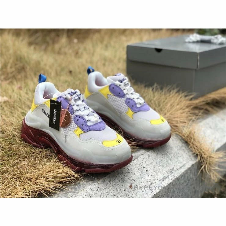 A remarkable pair of sneakers with purple, yellow, white, and red colorways is now seen on the Balenciaga Triple S White Purple Yellow. If you prefer multicolor footwear, a pair of sneakers with grey nonleather upper bases and purple and yellow accents are perfect for you. The sneakers also include triple sole features in a red tone which made them more fascinating on your feet. Wearing Balenciaga Triple S White Purple Yellow gives you a chance to show a tremendous style with your outfit.
