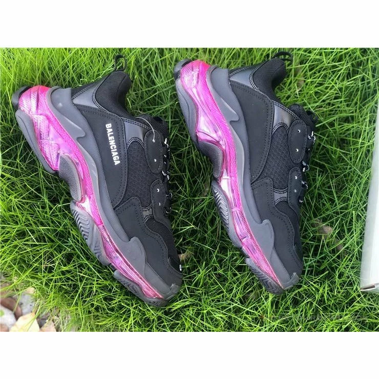 Bring on BCG Triple S Clear Sole – Black Pink Neon to your feet and discover how it rises up your streetwear look using its all-black and neon pink features.