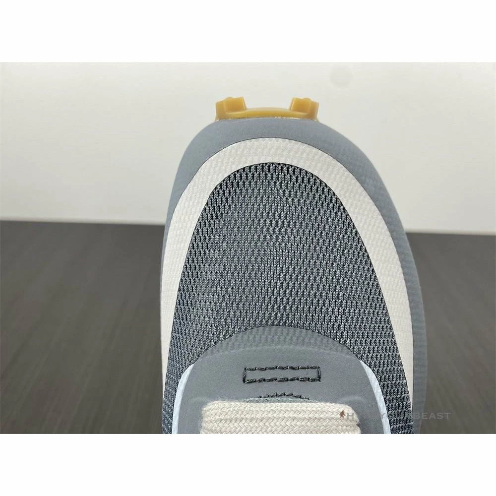 The sneaker features neutral grey tones in the upper that are made from semi-translucent mesh with fused synthetic overlays. It has white and gray laces for its double lacing system. Nike x Sacai x CLOT branding logo is stamped on the leather heel tab of the shoe, while woven Nike tags decorate in the doubled-up nylon tongues with colorways of grey and green. The sneaker is perched at the top of a double-stacked foam midsole, reinforced below the foot by an embossed rubber outsole.