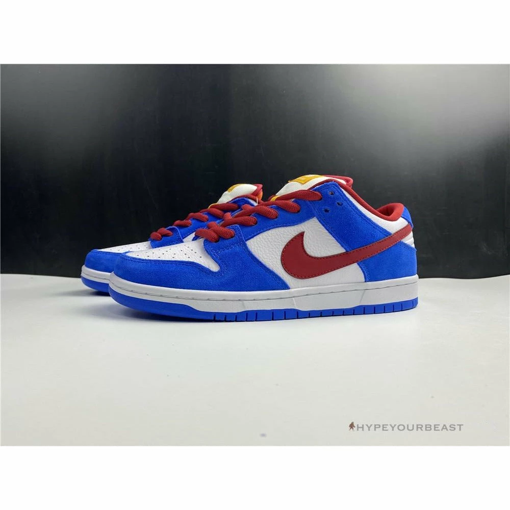 Nike SB Dunk Low Varsity Blue White Red recognizes the iconic Japanese icon Doraemon. This pair carries premium white leather on its perforated toe, mid-panel, and ankle collars while it includes blue overlays along its forefoot, eyelets, and heels. Its huge red Swooshes are killing its midfoot angle paired with its thick laces and interior. Nike SB Dunk Low Varsity Blue is spiced up with its clean white midsoles and blue rubber outsoles. Wearing this low-top pair of Nike SB Dunk Doraemon gives you an outstanding style and performance.