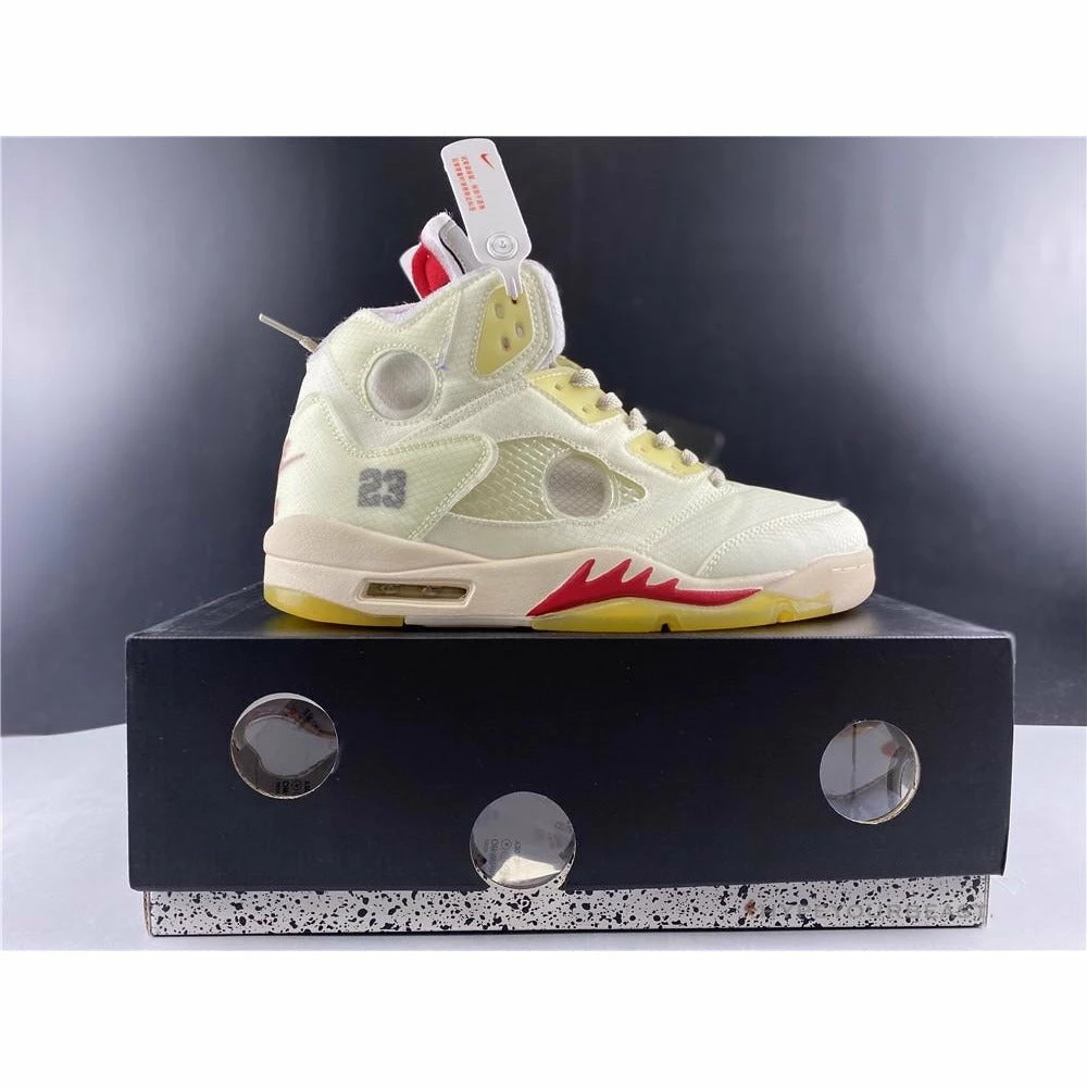 Captivating pair of sneakers is the main offer of Off-White x Air Jordan 5 White. This pair carries white and cream upper with its terrific translucent overlays. The sneakers include layering and elements in cream, black, and red tones. Air Jordan 5 White owns magnificent ankles and a long tongue with a red Jumpman. The side panel also reveals the black “23” prints. Besides that, the soles hold sail midsoles with red shark-tooth features and translucent forefoot outsoles. The pair is completed with a black hangtag. Wear this pair of sneakers and bring out another fascinating look on your feet.