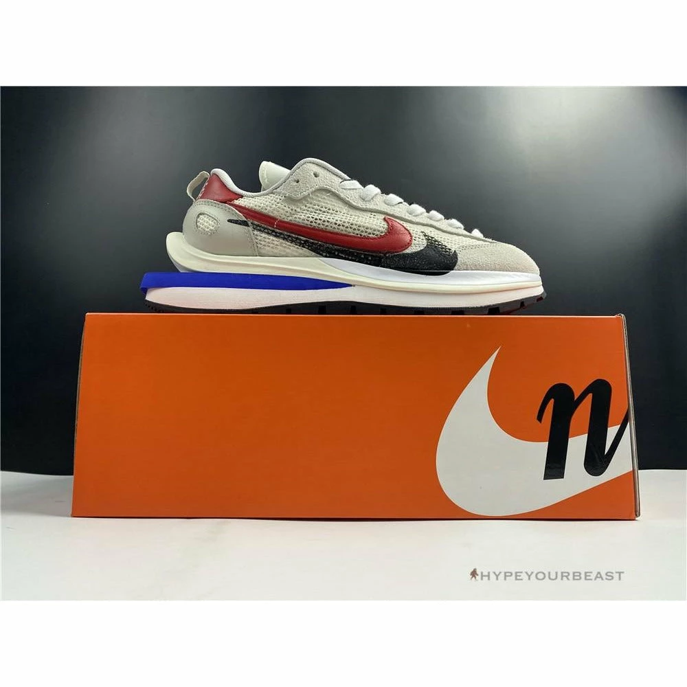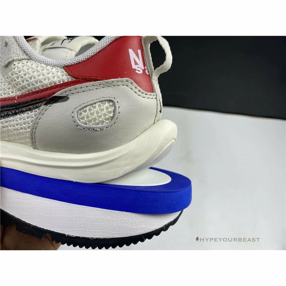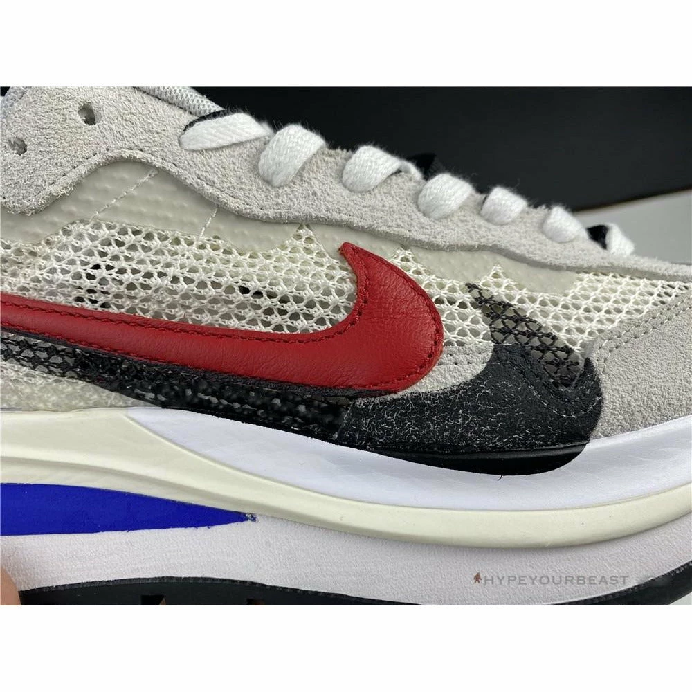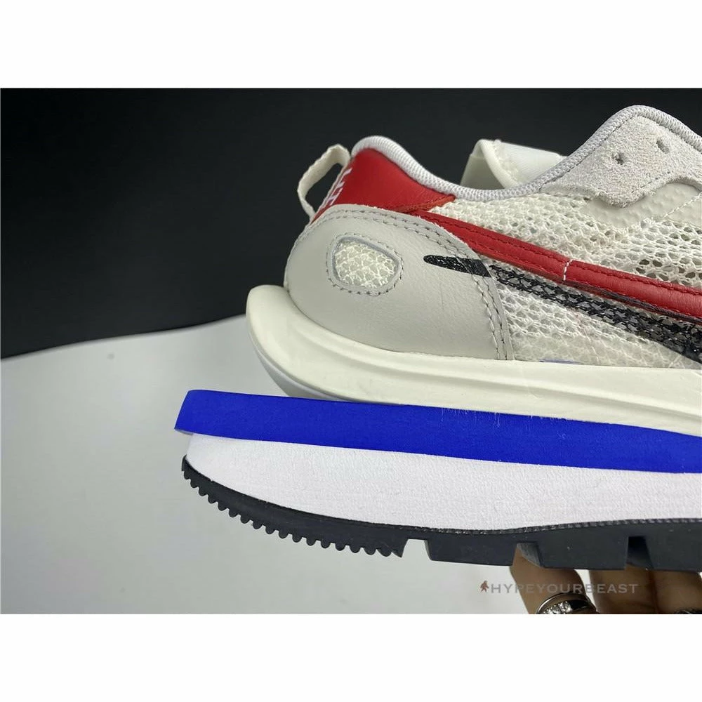The merging of Nike x Sacai Pegasus Vaporfly gave birth to an impressive Sacai Nike Pegasus Vaporfly White Red. This pair showcases the iconic cut-out wedge midsoles while it features mesh upper and dual accents. The sneakers are made from white mesh construction with dual Nike Swooshes of red and black. Besides that, the heel tabs also reveal red hues with white logo embroidery. As for the lacing system, it includes white nubuck eyelets and black and white laces. The pair also highlights the dual tongue to give a unique touch. Finally, the Nike x Sacai Pegasus Vaporfly White Red focuses on the cut-out Game Royal Blue wedge, white midsoles, and, black rubber outsoles.