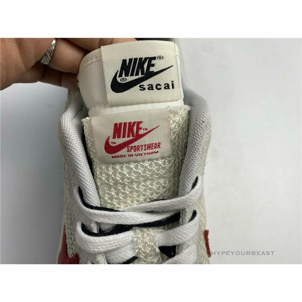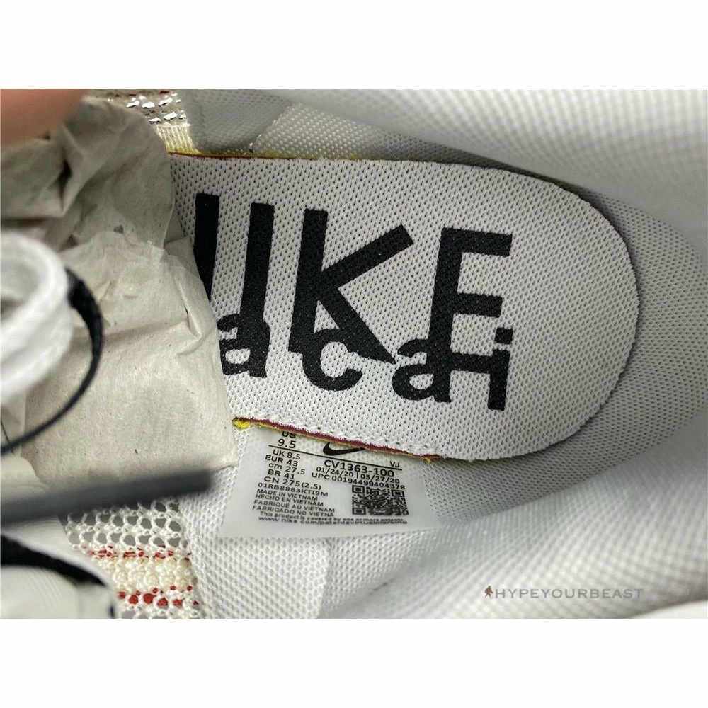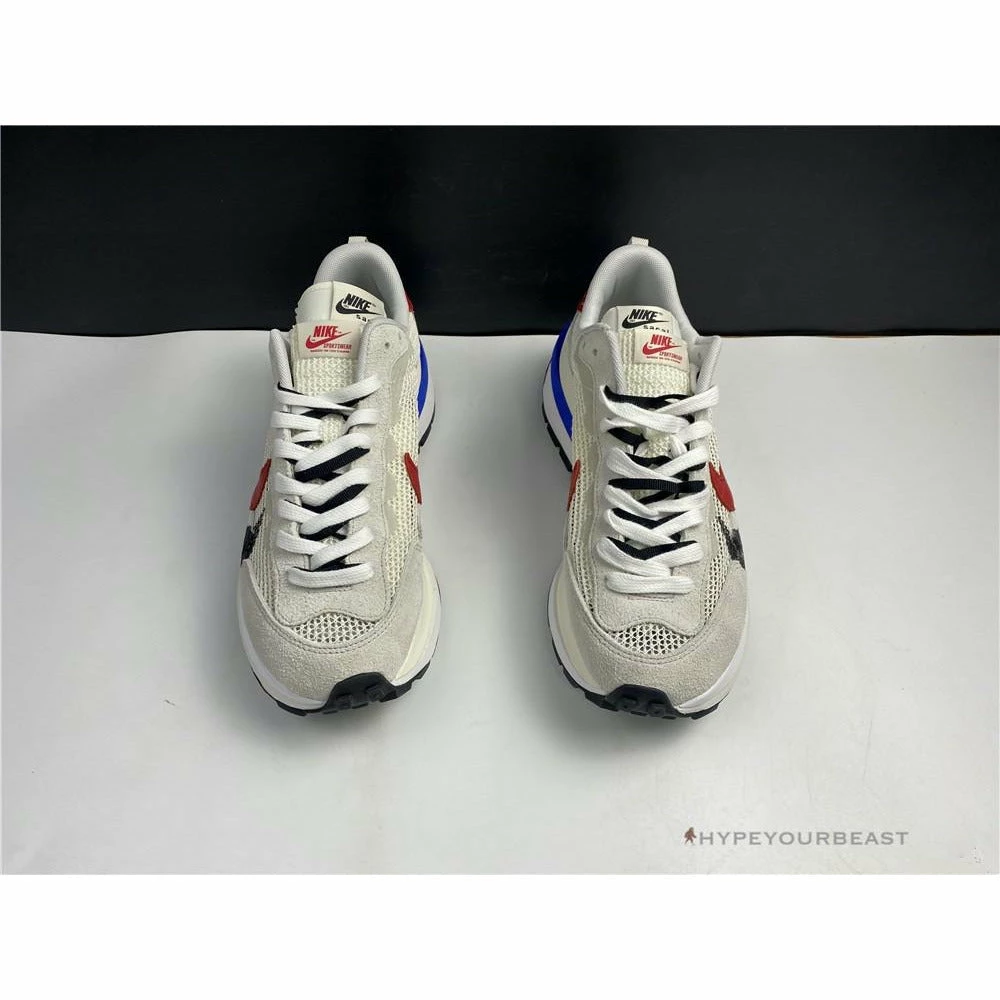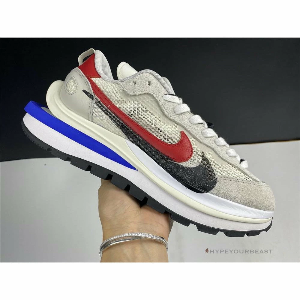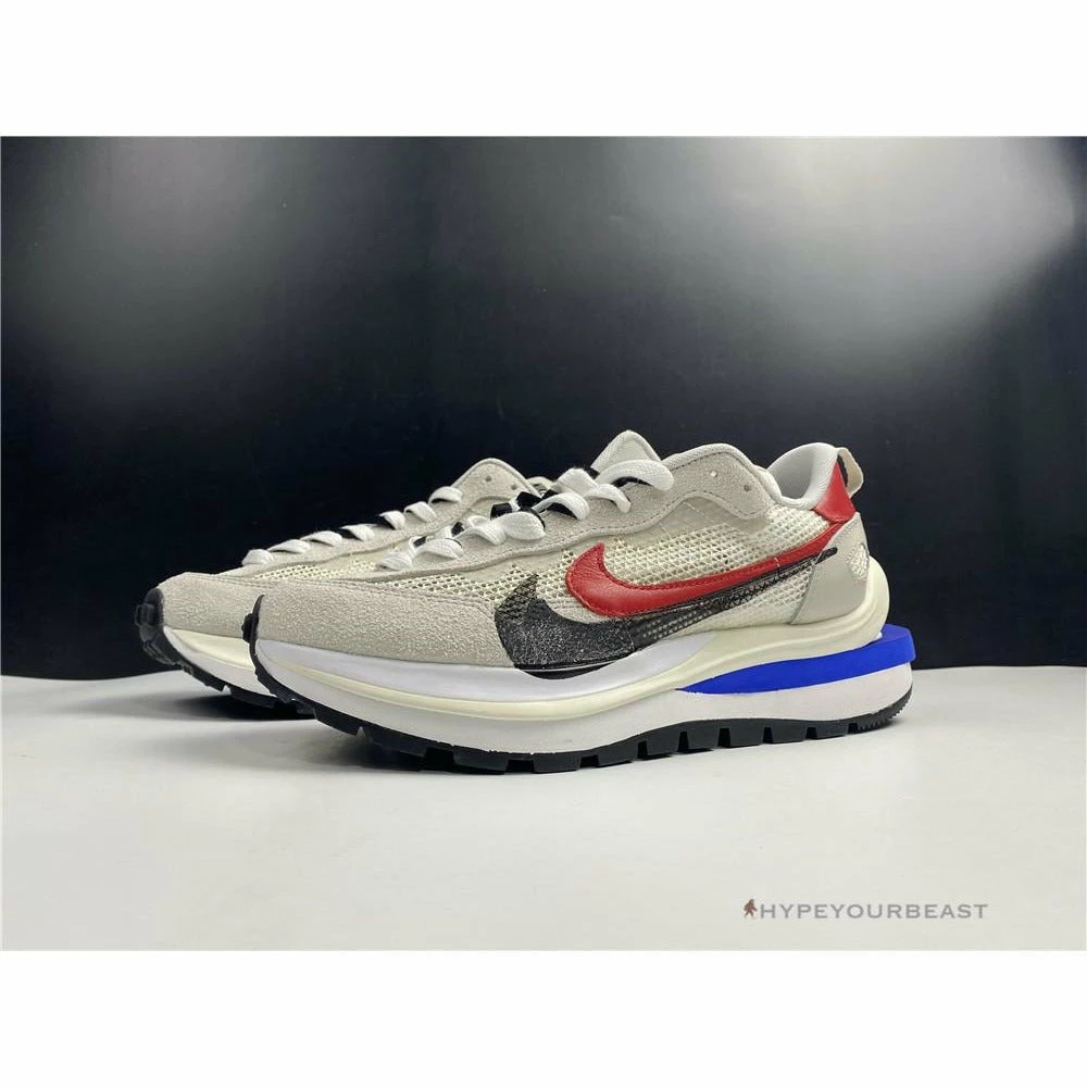 The merging of Nike x Sacai Pegasus Vaporfly gave birth to an impressive Sacai Nike Pegasus Vaporfly White Red. This pair showcases the iconic cut-out wedge midsoles while it features mesh upper and dual accents. The sneakers are made from white mesh construction with dual Nike Swooshes of red and black. Besides that, the heel tabs also reveal red hues with white logo embroidery. As for the lacing system, it includes white nubuck eyelets and black and white laces. The pair also highlights the dual tongue to give a unique touch. Finally, the Nike x Sacai Pegasus Vaporfly White Red focuses on the cut-out Game Royal Blue wedge, white midsoles, and, black rubber outsoles.