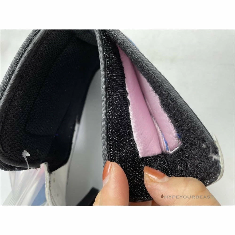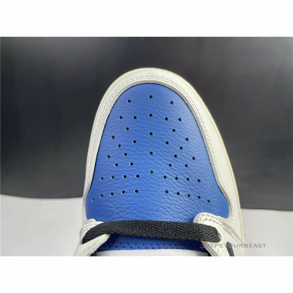 Black, blue, and white are the colorways of Travis Scott X Fragment X Air Jordan 1 High. This pair of footwear brings out white leather construction with Military Blue shade on its perforated toe, ankle collars, and heels. It also uses a black tone on its iconic Nike Swoosh in reversed positions. Besides that, Travis Scott X Fragment X Air Jordan 1 High also uses black shade on the ankle collars uniform to the lacing system. Appreciate these sneakers as it gives you a unique style on your feet.