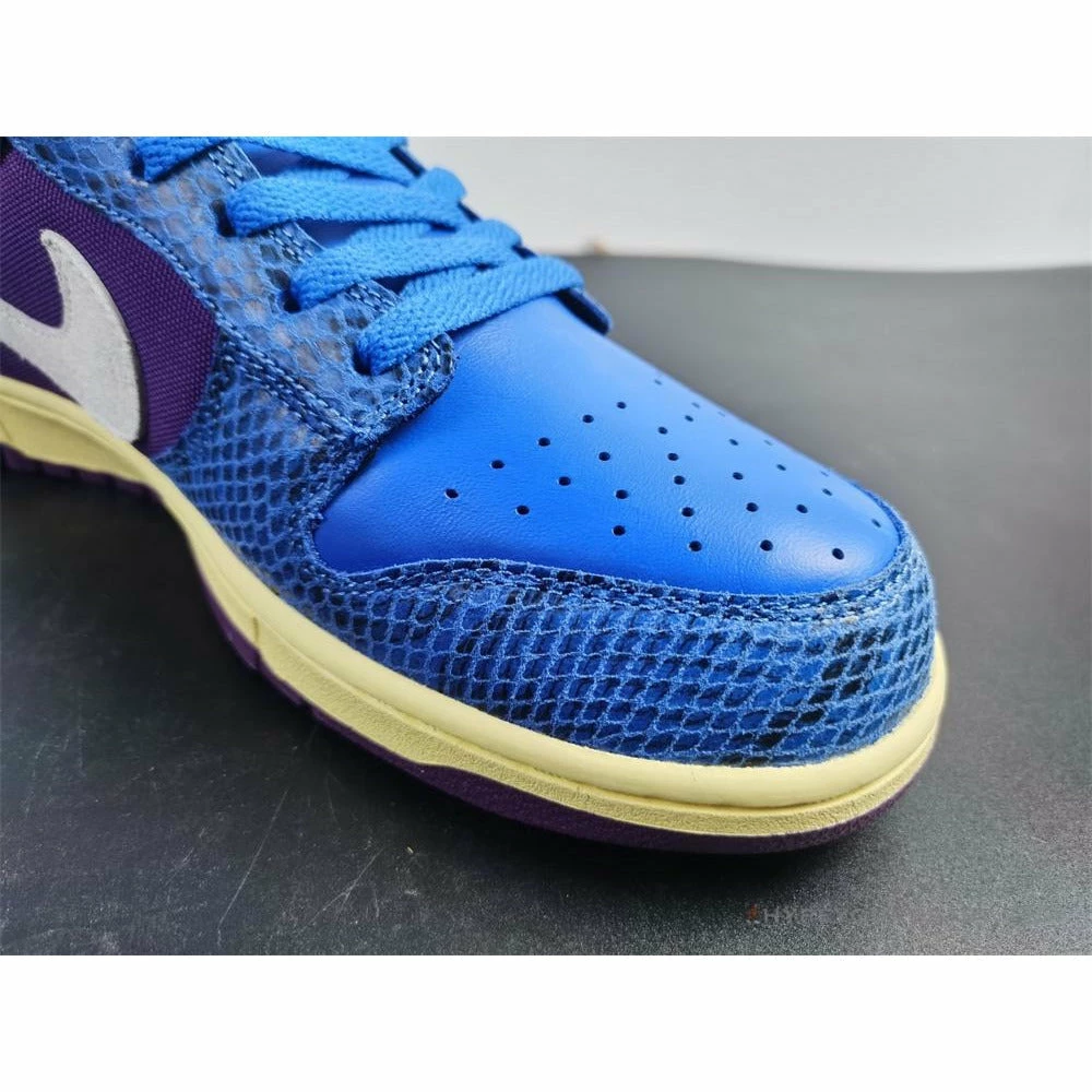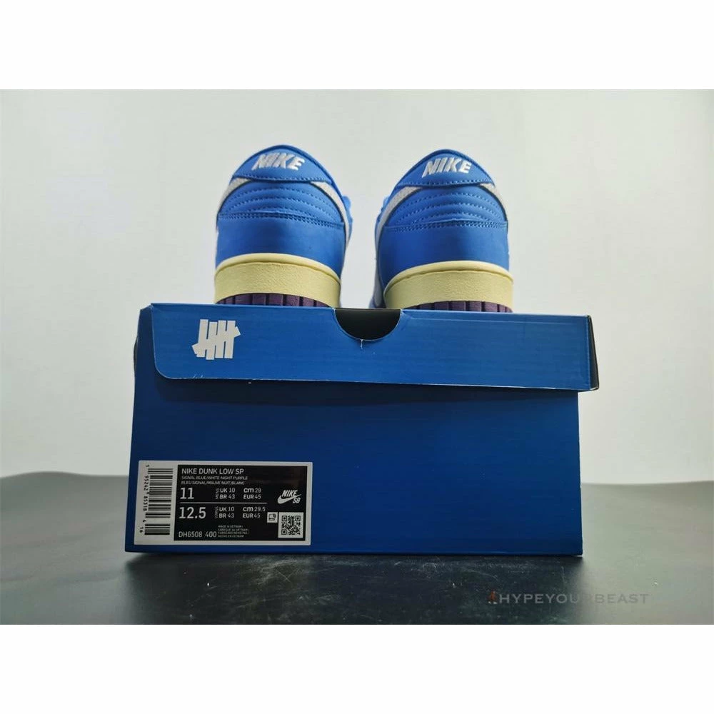 Nike Dunk Low Undefeated SP 5 On It brings you incredible accents present in the late 1990s and early 2000s. These sneakers carry fascinating colors including bright blue, purple, white, and pale yellow tones. Its upper has a combination of blue leather and nubuck construction along with its purple textile. It even carries white Nike Swoosh in suede materials. Nike Dunk Low Undefeated SP 5 On It are completed with a cream-colored rubber midsole and violet rubber outsoles.Â